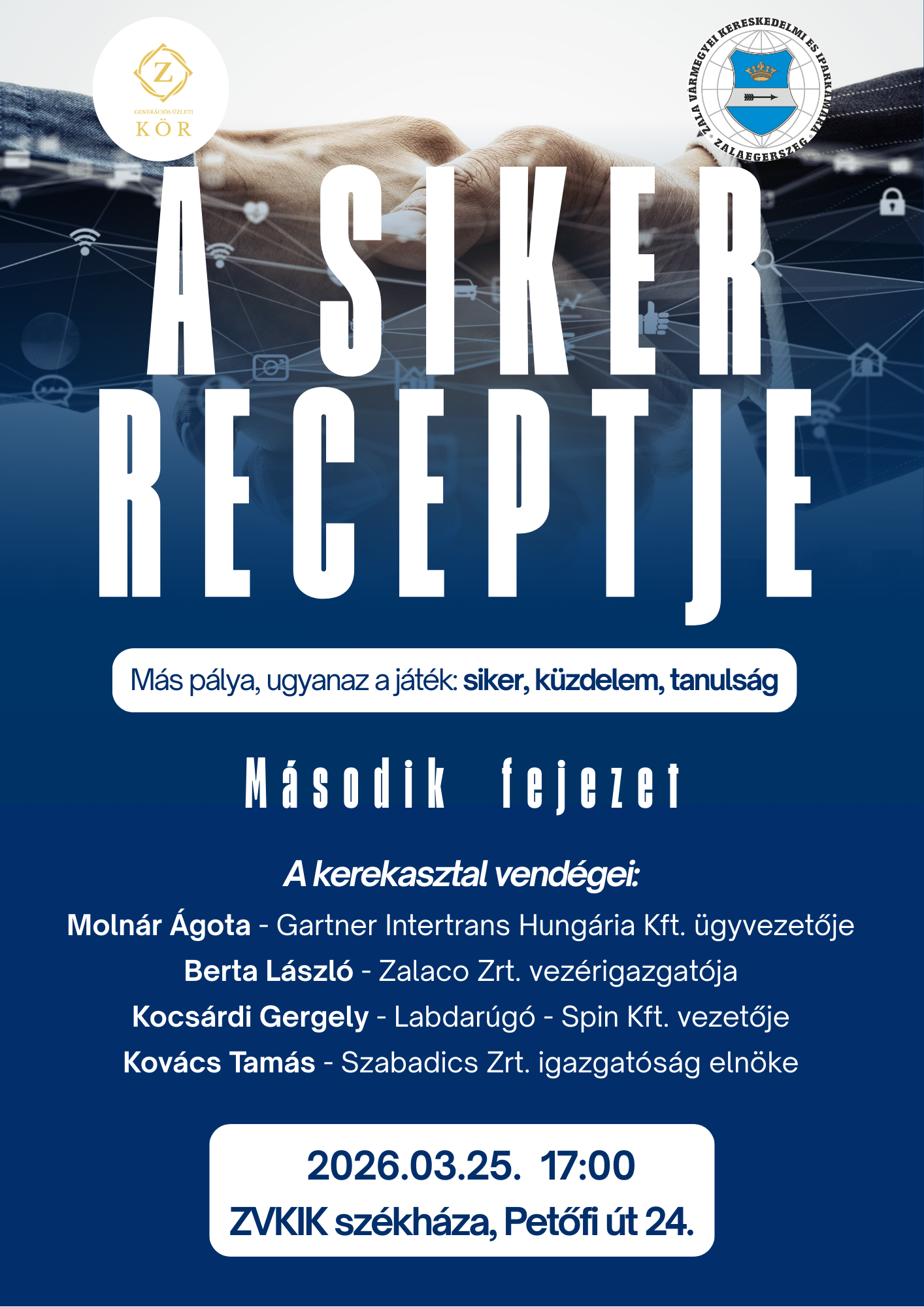 A Zala Vármegyei Kereskedelmi és Iparkamara Z Generációs Üzleti Köre 2026-ban is megrendezi nagy sikerű inspirációs eseményét, „A siker receptje” című pódiumbeszélgetést, amelynek középpontjában a siker valódi útja, háttere és emberi oldala áll.