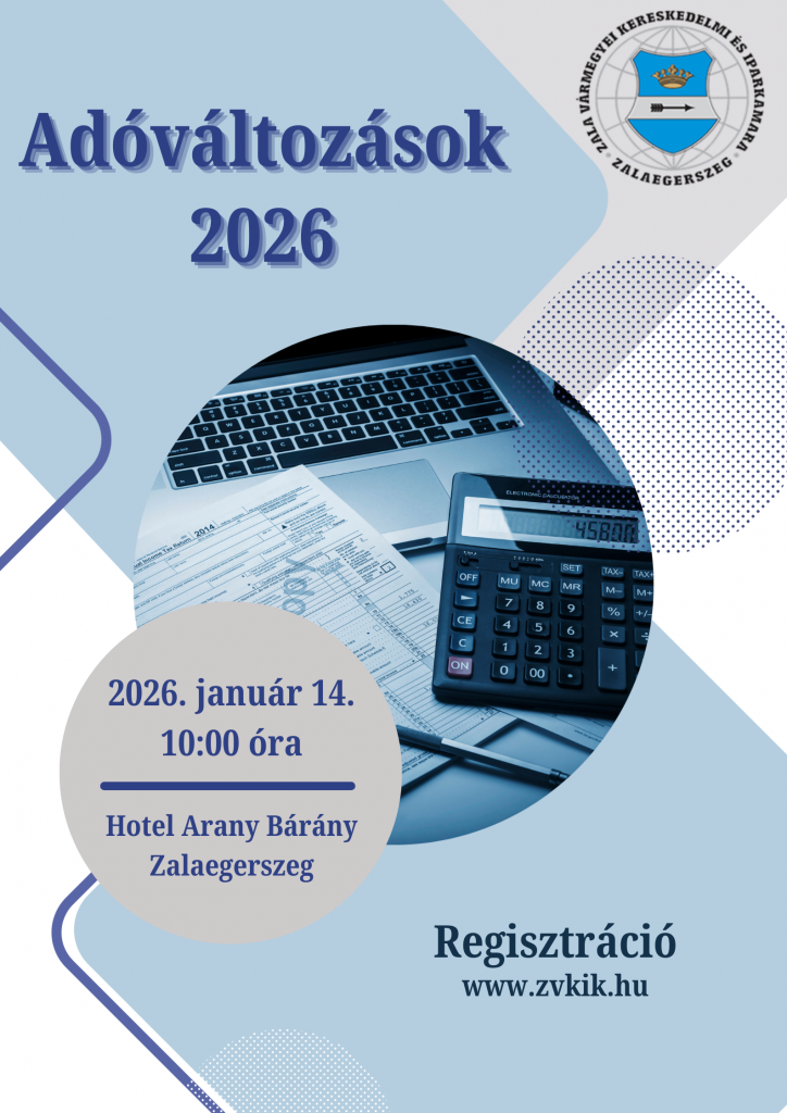 A Zala Vármegyei Kereskedelmi és Iparkamara 2026. január 14-én (szerdán) konzultációval egybekötött előadást tart „Adóváltozások 2026” címmel.