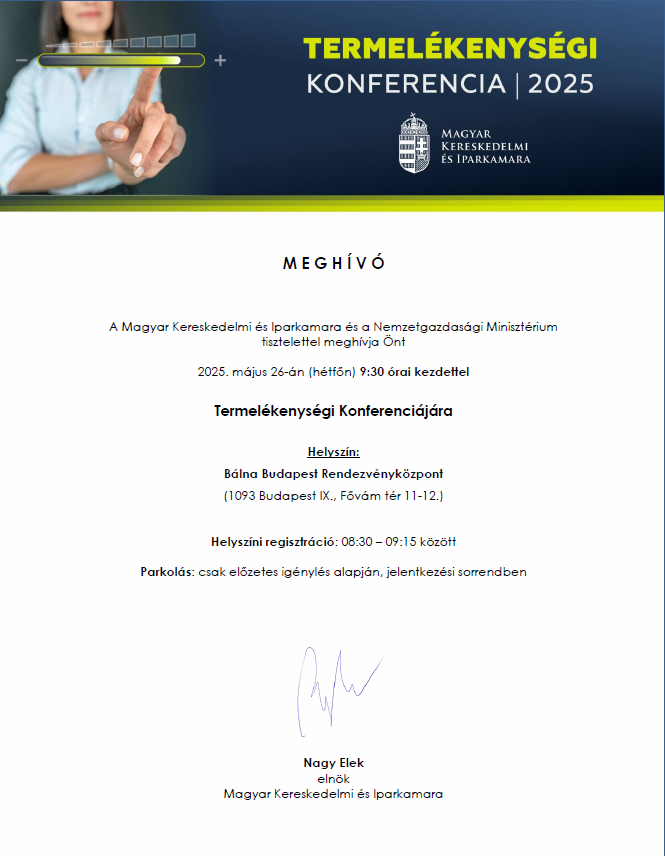 Termelékenységi Konferenciát tart 2025. május 26-án (hétfőn) 10:00 órai kezdettel a Magyar Kereskedelmi és Iparkamara és a Nemzetgazdasági Minisztérium.