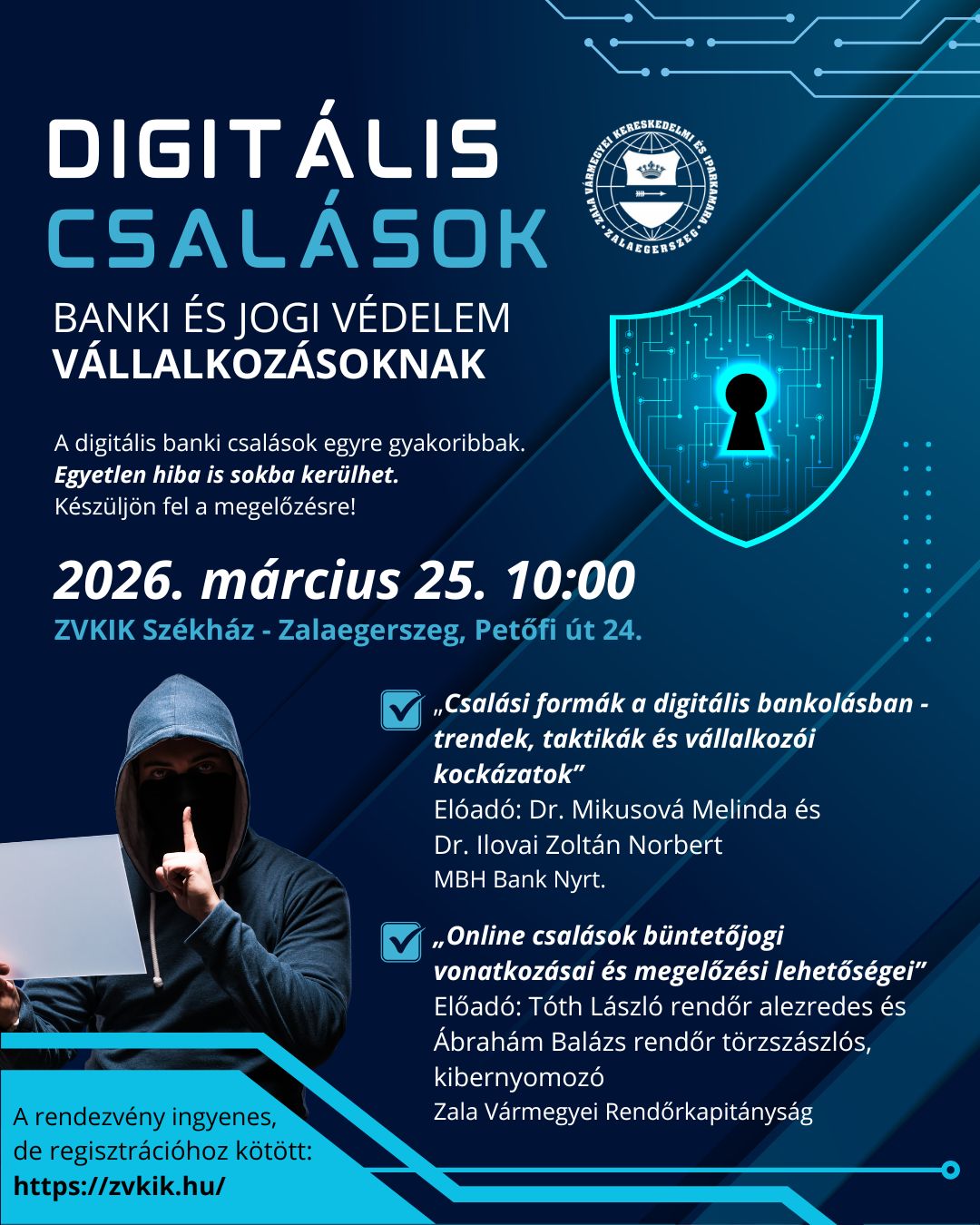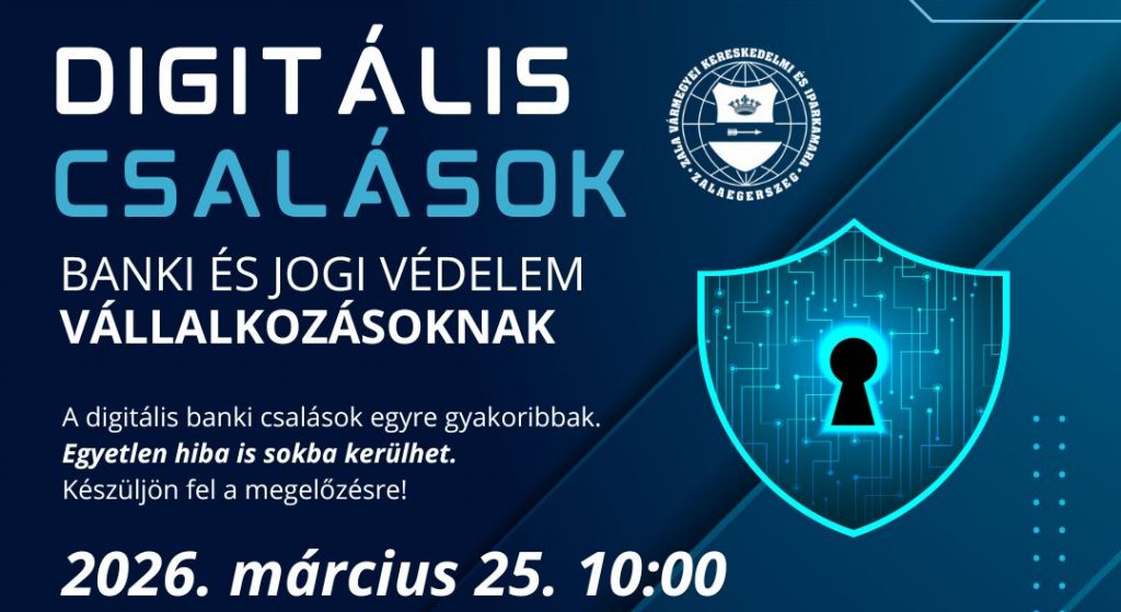A Zala Vármegyei Kereskedelmi és Iparkamara szakmai előadást szervez a digitális csalások témájában, amelynek célja, hogy a vállalkozások naprakész és gyakorlati tudást kapjanak az online banki visszaélések felismeréséről, megelőzéséről és jogi következményeiről.