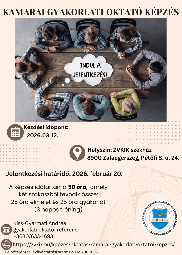 👉 A képzés részleteiről, a jelentkezés módjáról és a szükséges dokumentumokról az alábbi linken olvashat bővebben: https://zvkik.hu/kepzes-oktatas/kamarai-gyakorlati-oktatoi-kepzes/