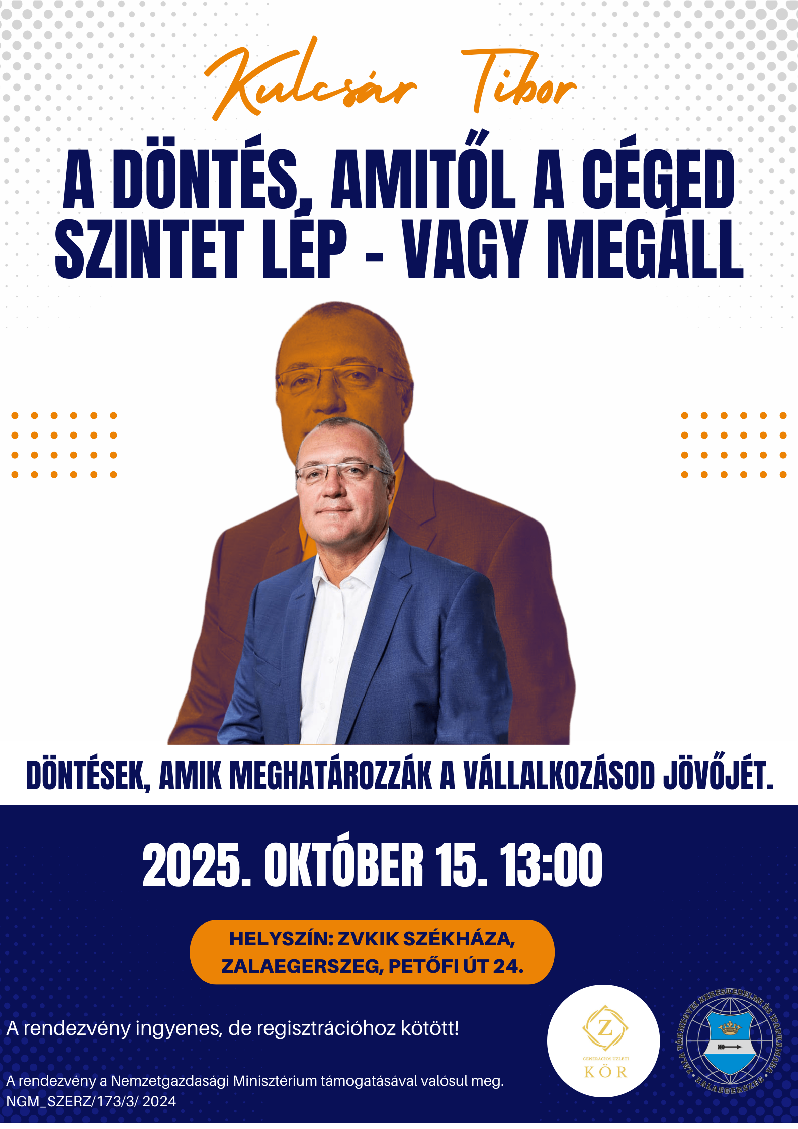 A Zala Vármegyei Kereskedelmi és Iparkamara székházába október 15-én érkezik Kulcsár Tibor, a Kulcs-Soft alapítója. Előadásában megosztja tapasztalatait arról, hogy: