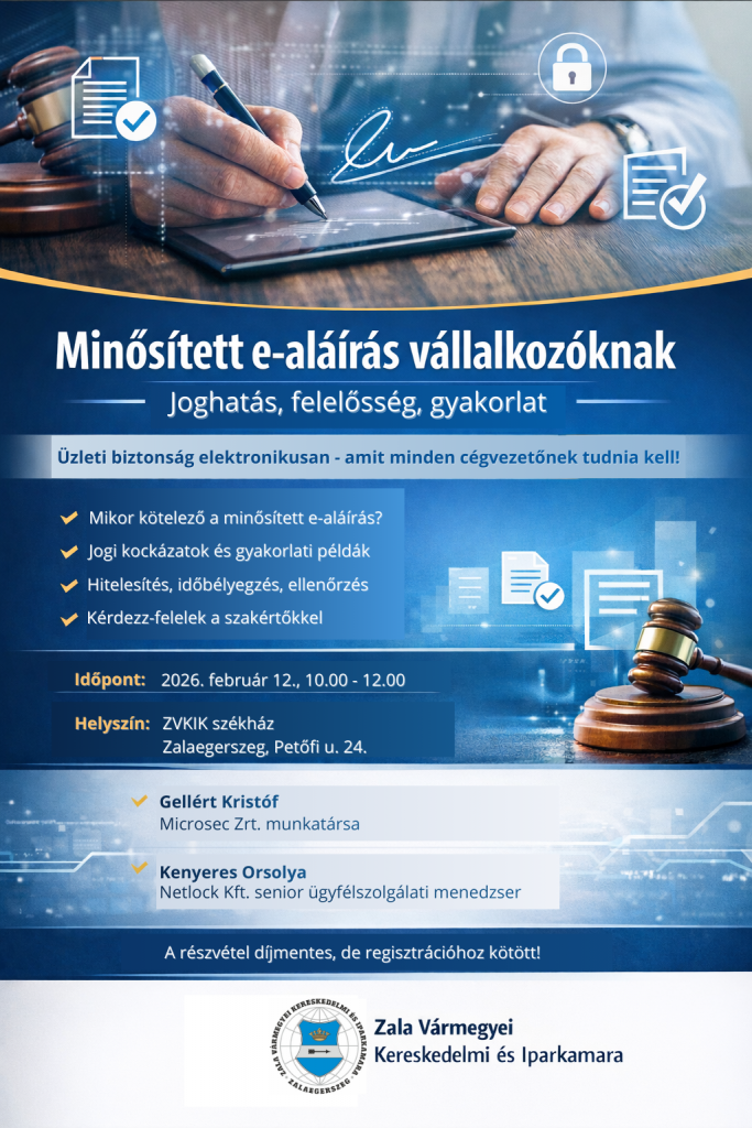 A Zala Vármegyei Kereskedelmi és Iparkamara egy kétórás, gyakorlatorientált szakmai előadást szervez, amely a vállalkozóknak minősített elektronikus aláírás jogi és üzleti kérdéseit járja körül.