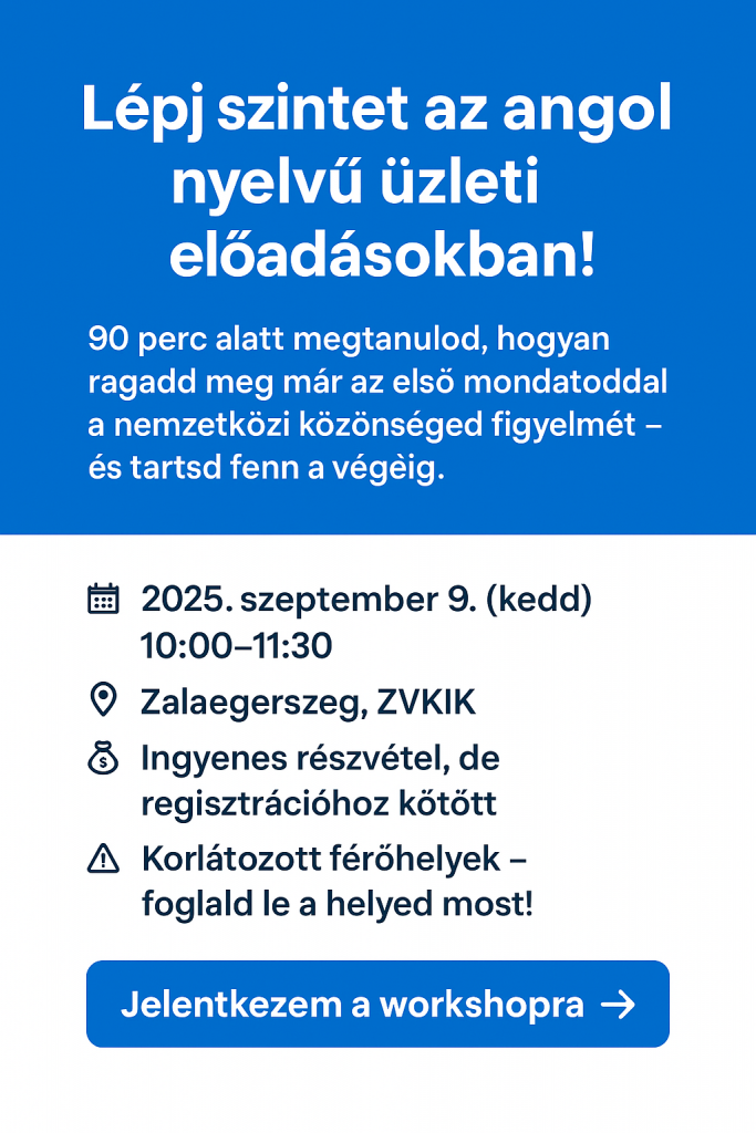 Ez a workshop konkrét technikákat és azonnal használható tippeket ad, hogy már az első mondatoddal magadhoz ragadd a közönséget és végig fenntartsd az érdeklődést.