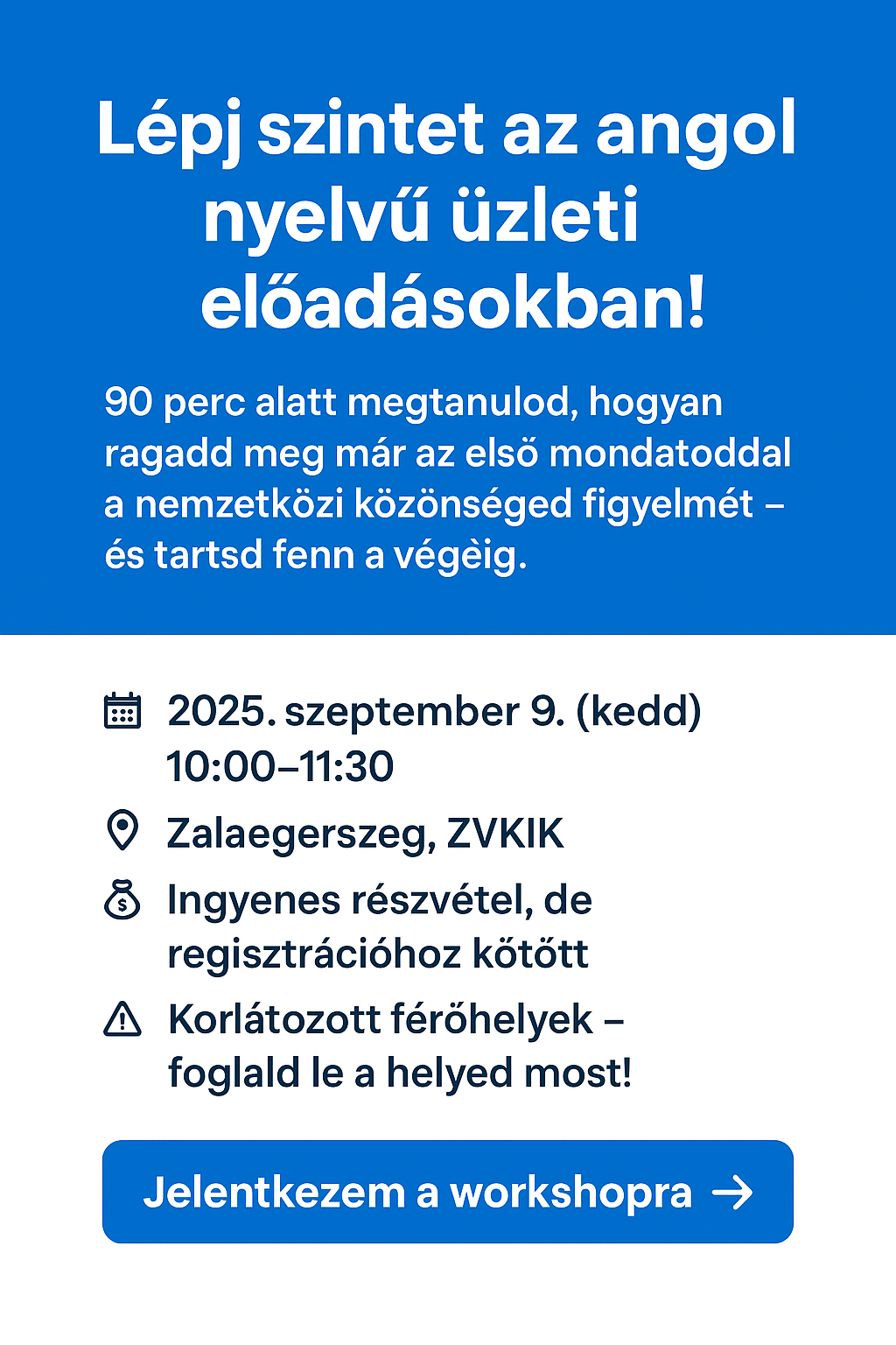 Ez a 90 perces, gyakorlatias program segít abban, hogy magabiztosan állj ki nemzetközi közönség elé angol nyelvű prezentációval.