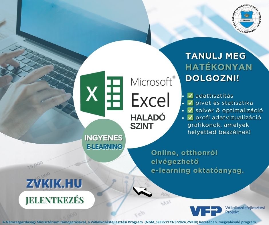 A Zala Vármegyei Kereskedelmi és Iparkamara ingyenes Haladó Excel e-learning tananyaga segít abban, hogy az Excel ne csak táblázatkezelő legyen számodra, hanem valódi döntéstámogató eszköz. A tananyag gyakorlati példákon keresztül mutatja be, hogyan lehet valós vállalati problémákat gyorsan és rendszerezetten megoldani az Excel magasabb szintű funkcióival.